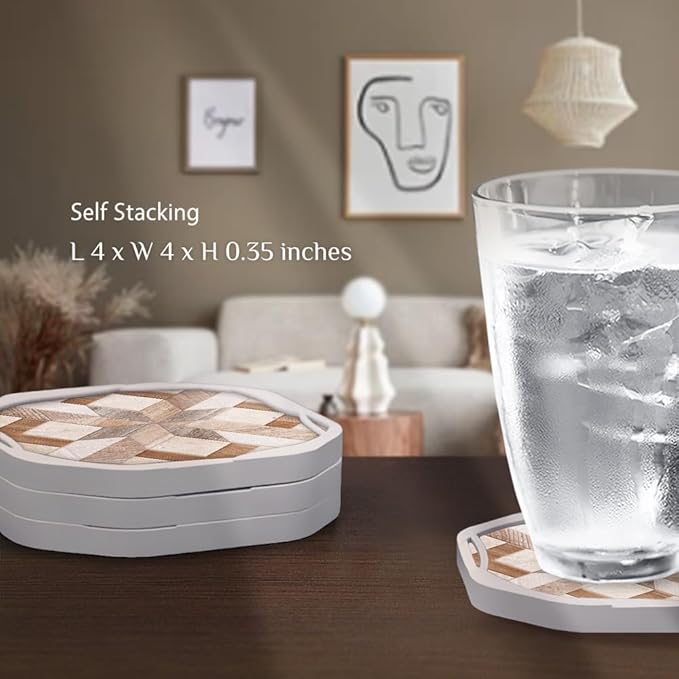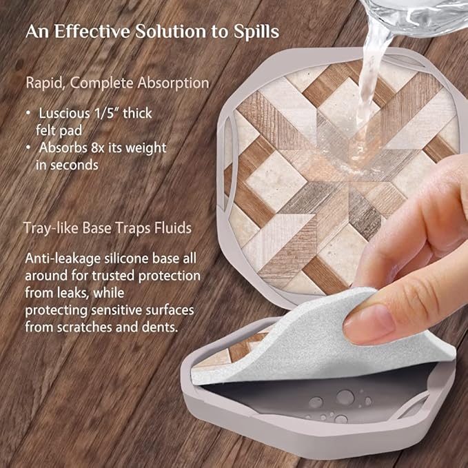 - RESPECT WOOD - Featuring material mashup, it effortlessly protects your table - all day, every day [ Safe from Spills and Permanent Damage ] The 1⁄5" thick soft felt pad can absorb as much as ¼ cup of liquid in seconds, and the silicone base offers leak-free protection while protecting your sensitive surfaces from scratches and dents [ Elevated Experience ] The embossed geometric pattern enhances grip without leaving residue while keeping air circulating to make the coaster easier to pick up