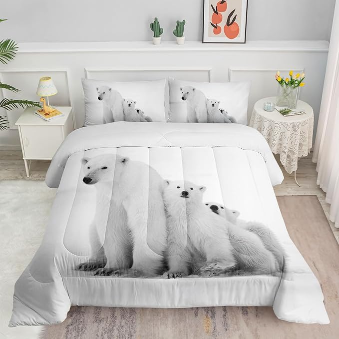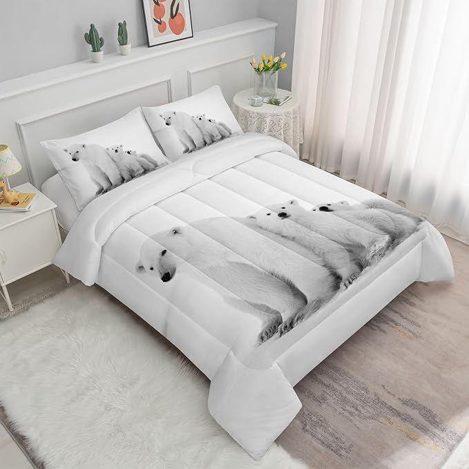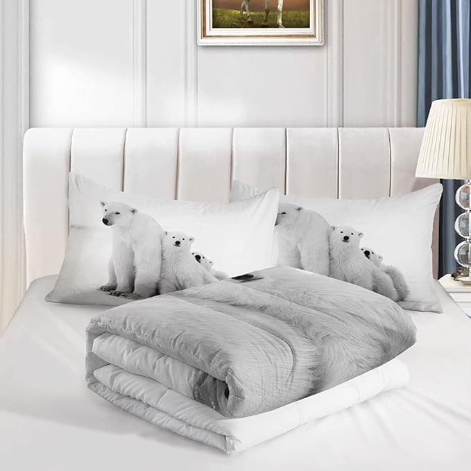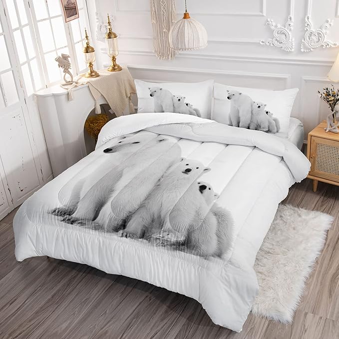 Bedding Comforter Set Polar Bear White Bear Printed Pattern Quilt Bedding Set with 1 Comforter and 2 Pillowcases for Girls and Boys Bedroom All Season(Polar Bear Queen)