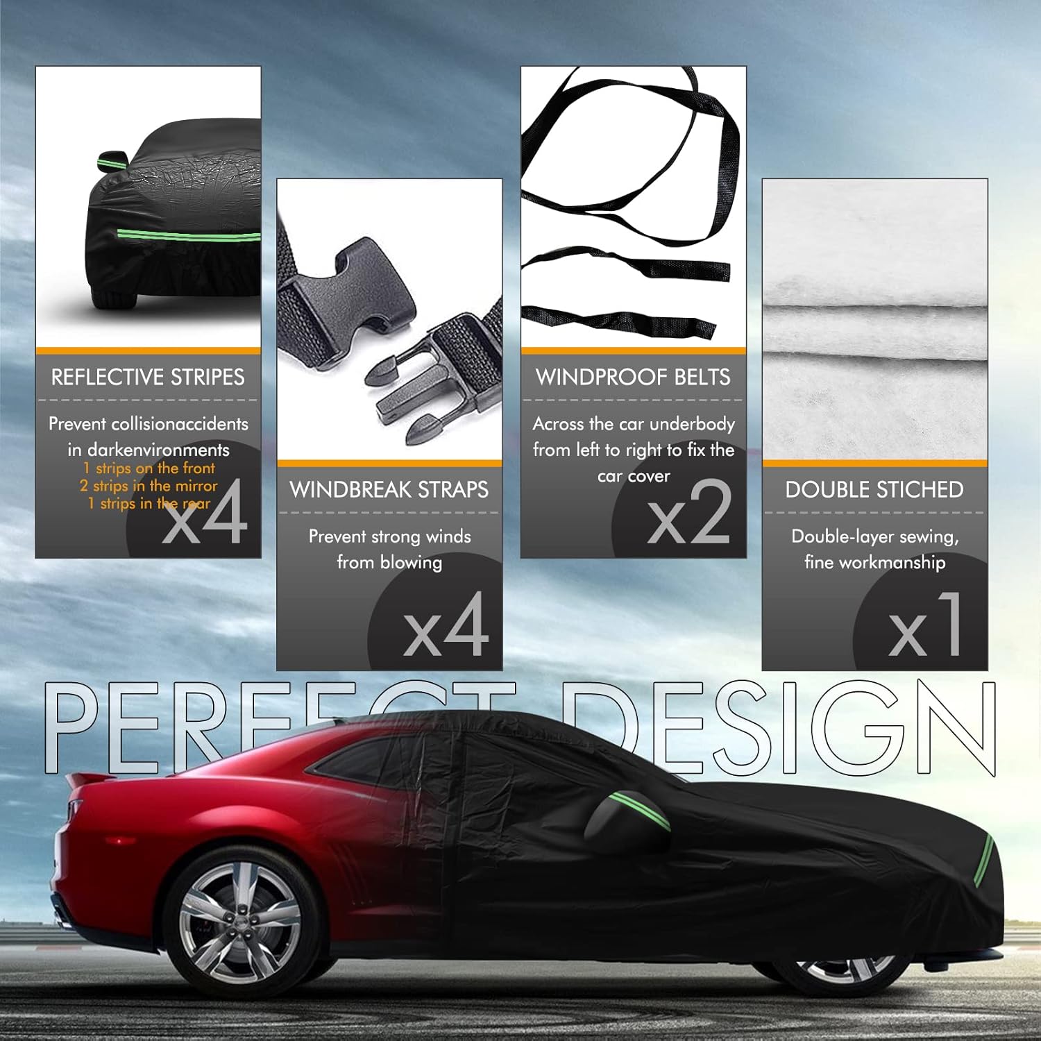 - 🚙【Compatibility】DTNESS car covers can measure up to 190 x 75.4 x 53.6 inches (L*W*H). Custom designed for perfect compatibility with 2010 2011 2012 2013 2014 2015 2016 2017 2018 2019 2020 2021 2022 Chevy Camaro. (Other models of the same size are also compatible.)
