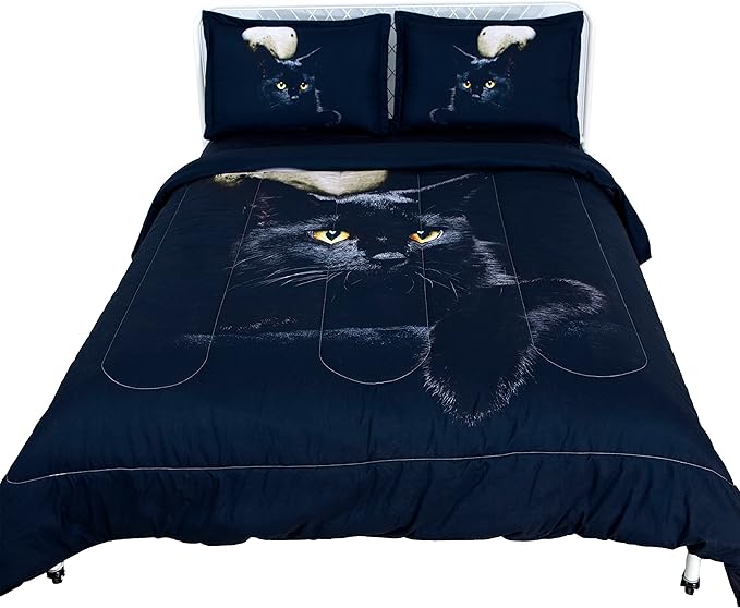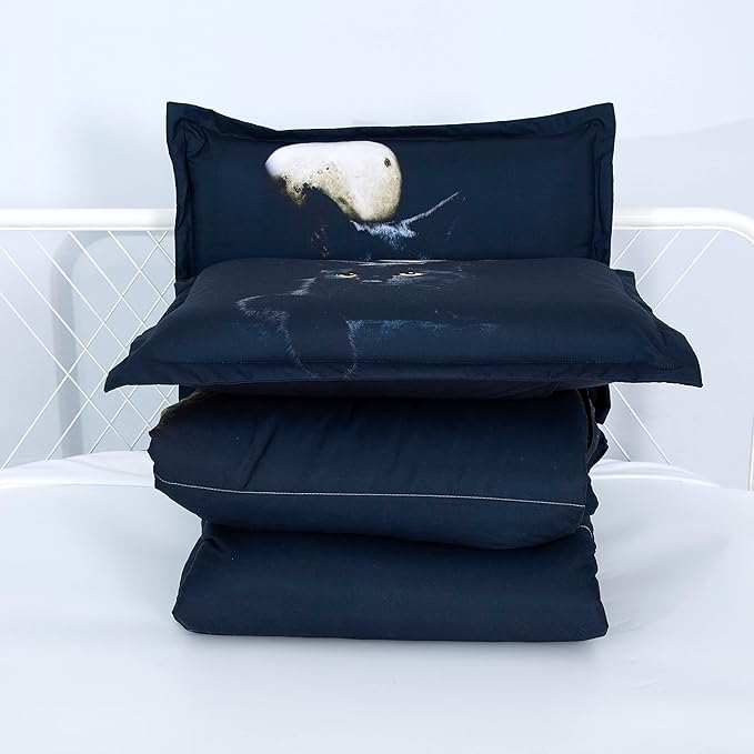 Black Cat Comforter Set,3D Cartoon Cat Comforter Full,Animals Print Bedding Set for Kids Girls Boys Cat Quilt Set with 1 Comforter and 2 Pillow Cases Bedroom Decor