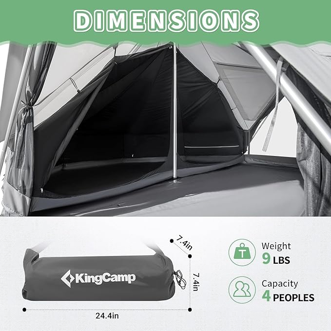 - SPACIOUS DESIGN: Offering ample space with an expanded size of 17.9 x 8.2 x 6.9 feet, this inner tent comfortably fits up to 4 people, providing plenty of room for everyone to stretch out and enjoy a restful sleep. The spacious design allows for free movement, perfect for families or small groups. The double-door design ensures easy access and smooth entry and exit, enhancing your overall camping experience.