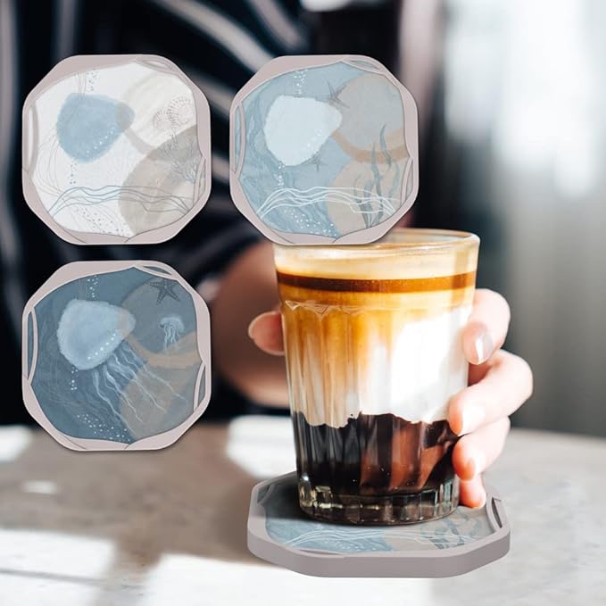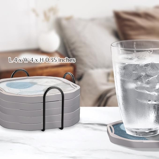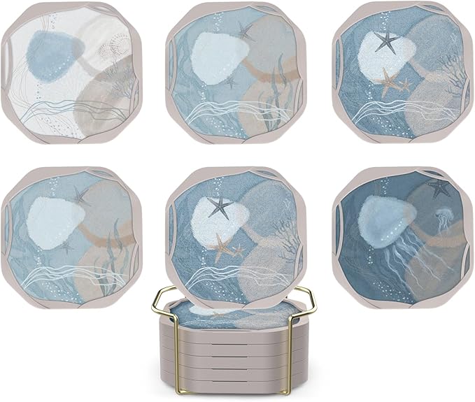 UMIRRO Absorbent Drink Coasters, Coastal Themed Cup Mat for Beach Lovers, Ocean Inspired Coffee Table Decor, Small Unique Birthday Gift Ideas for Men, Dad, Him, Women Mom, Her, 4", Bule, Set of 6