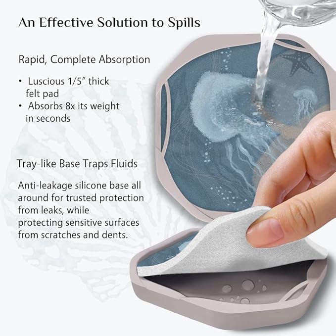 - RESPECT WOOD - Featuring material mashup, it effortlessly protects your table - all day, every day [ Safe from Spills and Permanent Damage ] The 1⁄5" thick felt pad can absorb as much as ¼ cup of liquid in seconds, and the silicone base offers leak-free protection while protecting your sensitive surfaces from scratches and dents [ Elevated Experience ] The embossed geometric pattern enhances grip without leaving residue while keeping air circulating to make the coaster easier to pick up