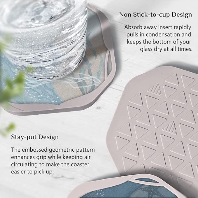 - HYBRID SILICONE AND FELT - It combines the best of both materials for a lightweight yet durable, all-purpose coaster. The non-slip silicone base keeps your cups in place while the super absorbent felt pad soaks up any moisture from your glass. In addition, the case has a lip with charming reliefs around the edges, which nicely frames the tailored insert, preventing it from popping up