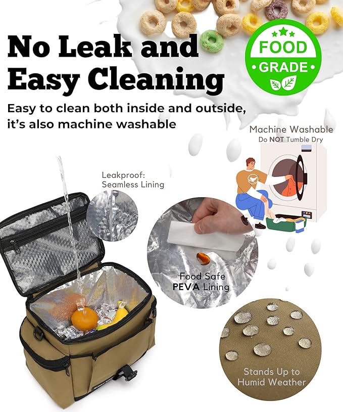 - Easy to clean and leakproof - The exterior is made of a high-density fabric that is rain-resistant and tear proof. Water beads up on the surface, keeping the bag dry even in wet conditions. While the inner PEVA lining is non-porous and seamless that doesn’t let liquid through, so you won’t have leaks or spills. If you do spill something, like soup, oil, or tomato sauce, it's easy to clean up.