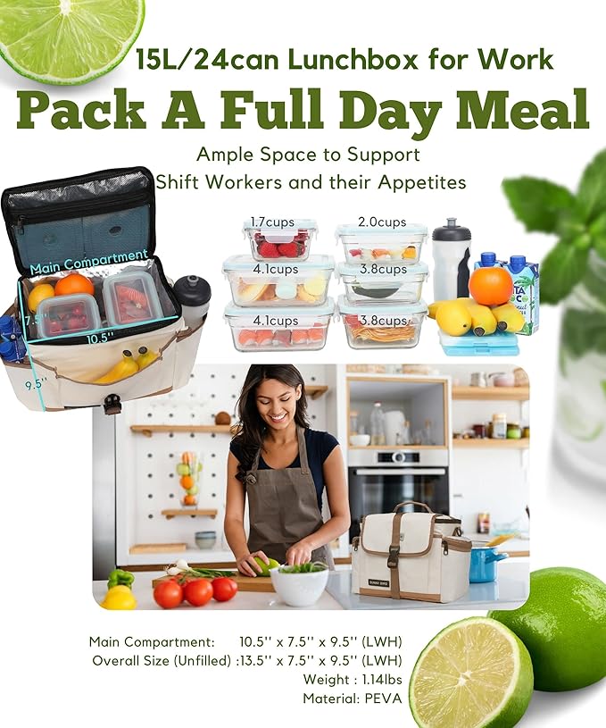- Large capacity - Our lunch bag is spacious, measuring 13.5''L x 7.5''W x 9.5''H. With a capacity of up to 15L or 24 cans, it provides ample space to store your food and drinks. Great for a full day of work or for outdoor activities like picnics or camping.