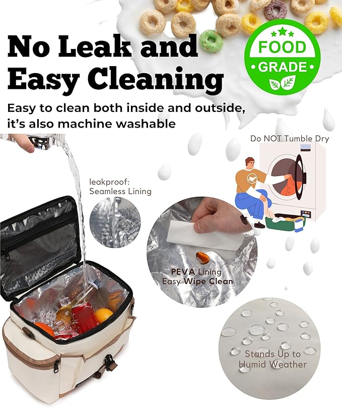 - Easy to clean and leakproof - The exterior is made of a high-density fabric that is rain-resistant and tear proof. Water beads up on the surface, keeping the bag dry even in wet conditions. While the inner PEVA lining is non-porous and seamless that doesn’t let liquid through, so you won’t have leaks or spills. If you do spill something, like soup, oil, or tomato sauce, it's easy to clean up.