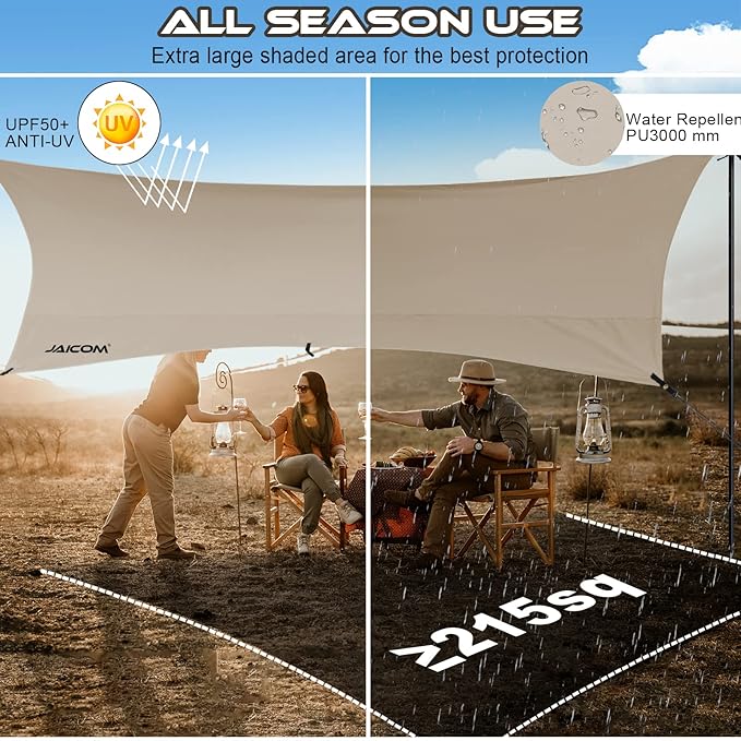 - EXTRA LARGE SHADING AREA: The JAICOM camping tarp has an unfolded size of 14 x 12 feet, providing a large shade area of approximately 215 square feet. It has a package size of 17.3 x 4.7 inches and weighs only 7 pounds, making it easy to carry and pack into a backpack to take anywhere
