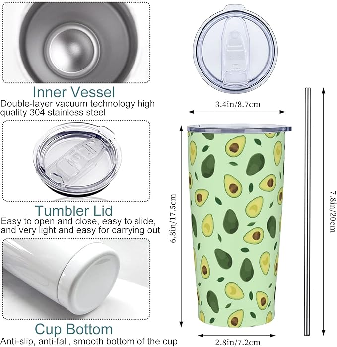 Avocado Tumbler with Lid and Straw, 20 Oz Stainless Cup Steel Insulated Water Bottle Travel Coffee Mug