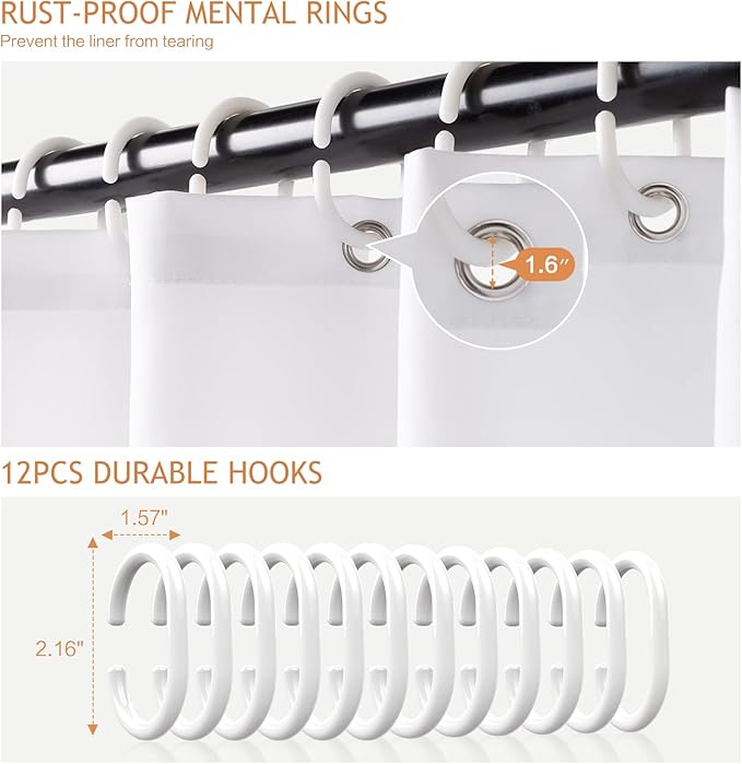 - 【12 Hooks & 12 Rust-Proof Metal Rings】 -- 12 hooks correspond to 12 rust-proof metal rings. The strong hooks support the shower curtain perfectly. Detachable hooks are convenient for hanging the rainbow shower curtain. The strong metal rings in shower curtain effectively prevent the liner from tearing and make the shower curtain more durable.