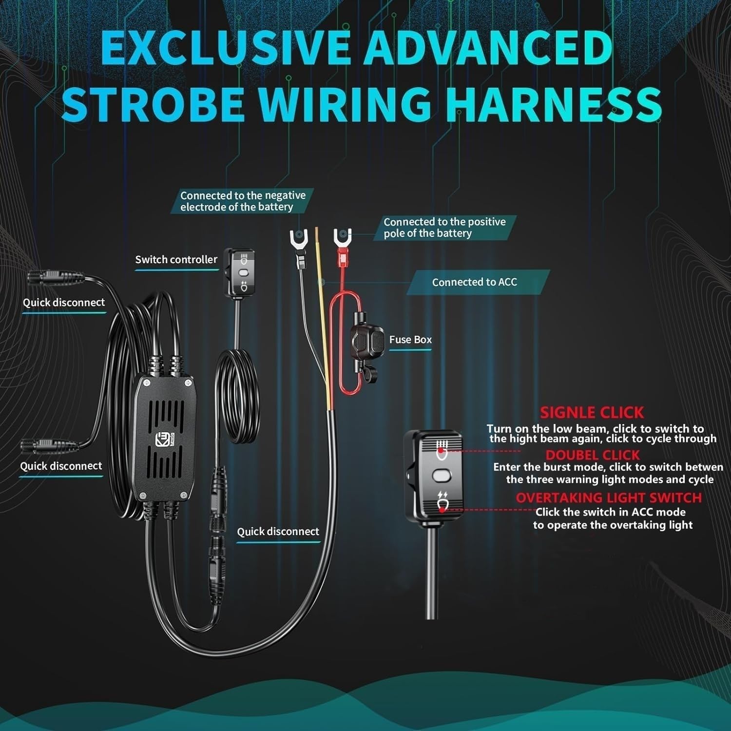 - Light Modes + Warning Light Modes: Our motorcycle auxiliary light with 6.7ft waterproof harness kit. The light mode can be freely switched on and off with the switch: white or amber, warning light mode: left and right time-sharing strobeor left and right alternating strobe or left and right simultaneous strobe - the different light modes can be adapted to the different weather conditions encountered during the ride NOTE: THE YELLOW LINE MUST BE CONNECT, CAN BE CONNECT ACC OR POSITIVE POLE OF BATTERY