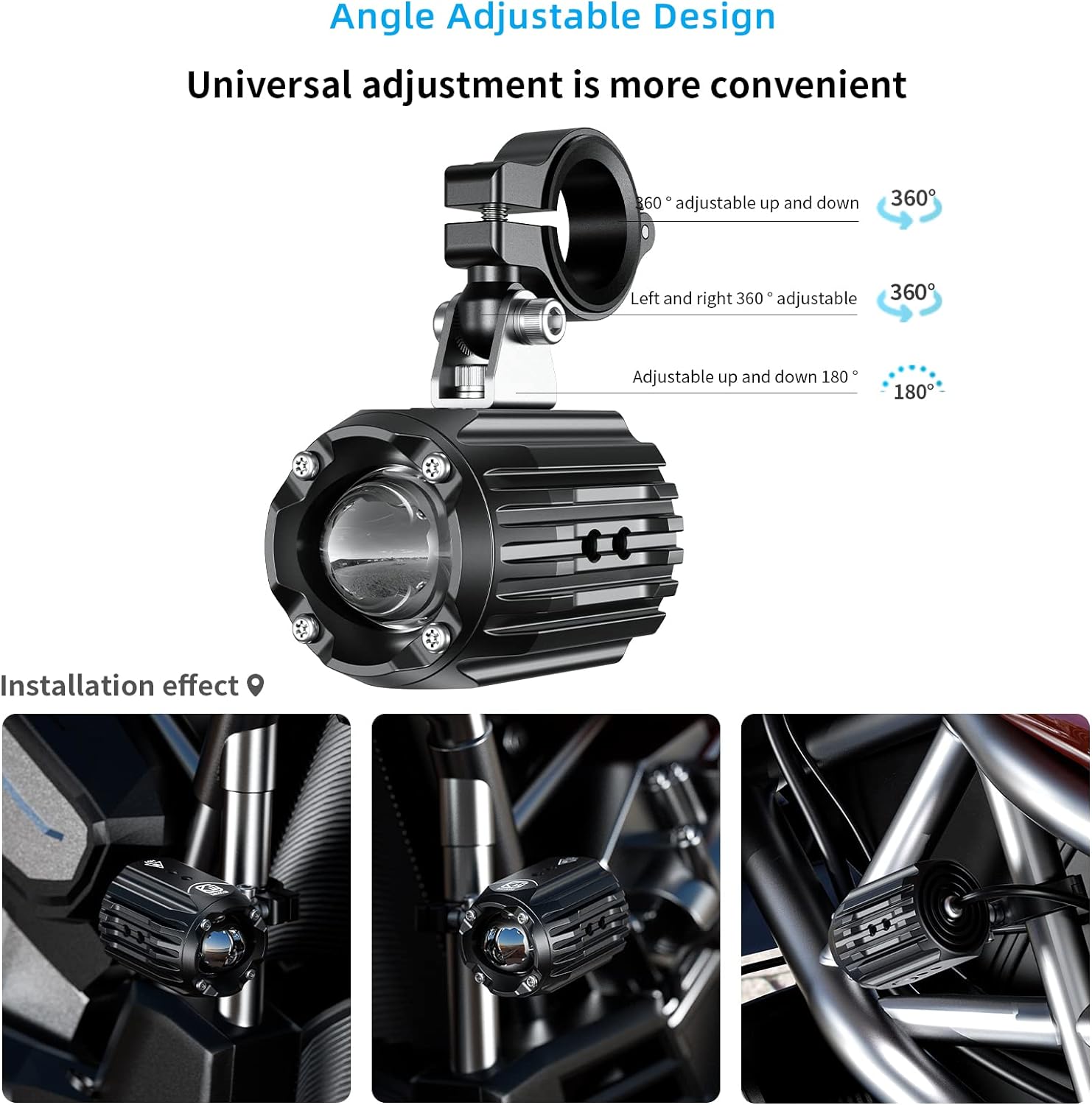 - Multiple mounting options: Motorcycle LED driving fog lights is make of aluminium alloy base and the stainless steel body fixing bracket form a universal bracket that can be adjusted at any angle, The 3 sizes of sleeves (22 mm, 25.4 mnm, 28.6 mm) included in the package will fit most handlebar diameters and can be mounted in the position you want, depending on the diameter of your handlebar
