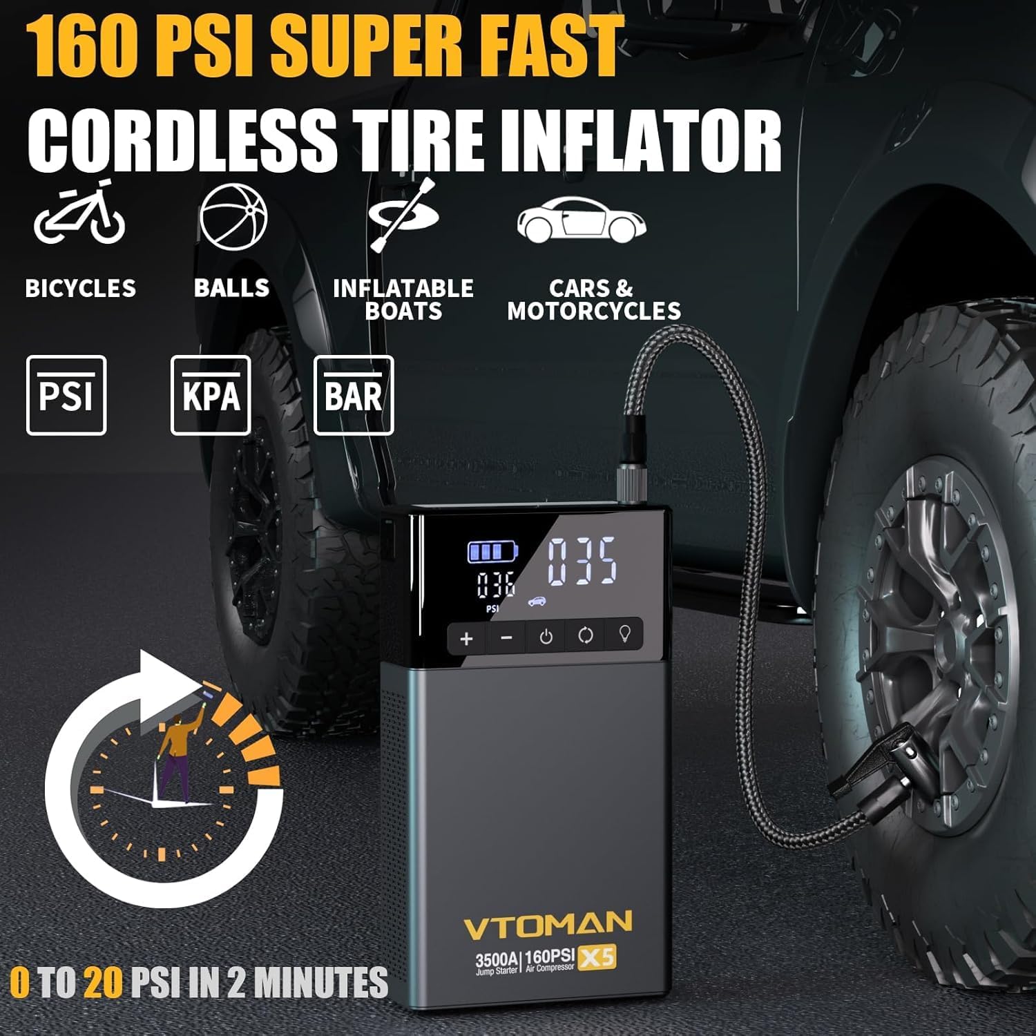 VTOMAN X5 Jump Starter with Air Compressor, 3500A Portable Car Battery Booster (Up to 9L Gas/8L Diesel Engines) with 160PSI Digital Tire Inflator, 12V Lithium Battery Jump box with Type-C Quick Charge