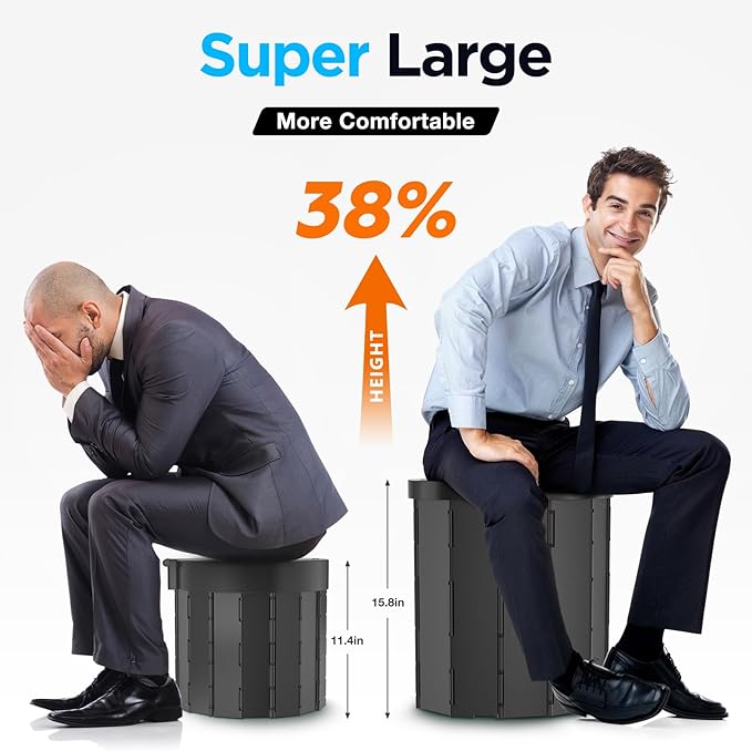 - LARGE PORTABLE TOILET FOR ADULTS - The height of the portable toilet for camping is 15.8” which is 38% higher than old version and most other collapsible toilets. Wider seat cover for more comfortable sitting. The porta potty can set up in seconds and safely holds up to 400 lbs on stable ground. Constructed from waterproof ABS plastics, easy clean up. It is ideal for people dealing with IBS or Crohn’s disease, as its portable design gives you the freedom to go anywhere.