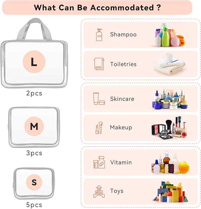 - 【10 Pieces 3 Diffrent Sizes】2 x Large clear handbag,11.8" x 3.9" x 8.6";3 x Medium clear toiletry bag,9.4" x 1.9" x 7.8";5 x Small clear cosmetic bag,7" x 1.5" x 5.5". The clear travel bags perfect for cosmetics, toiletries, baby items, shaving kit, electronic devices, perfume, sunglasses, lipstick, facial cleanser, passport and so on.