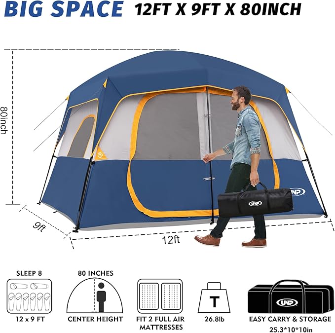 - Roomy 8 People Family Tent: Spacious design offers enough room for 8 people (most comfortable: 6 person + Gears), 12' x 9' x 80"H, 2 air mattresses or 8 sleeping bags are well fit in the tent, 80 inch center height is enough for you to stand up changing
