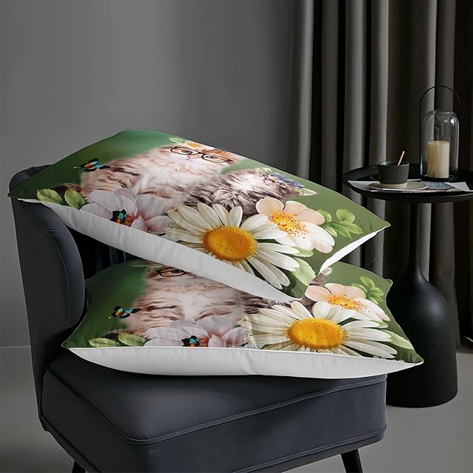 AILONEN Cats Bedding Set Queen Size with Wearing Black Glasses Fluffy Cat Print Comforter Set for Kids Girls, Daisy Flowers Butterfly Soft Breathable Duvet Set 3 Pieces, 1 Quilt and 2 Pillowcases