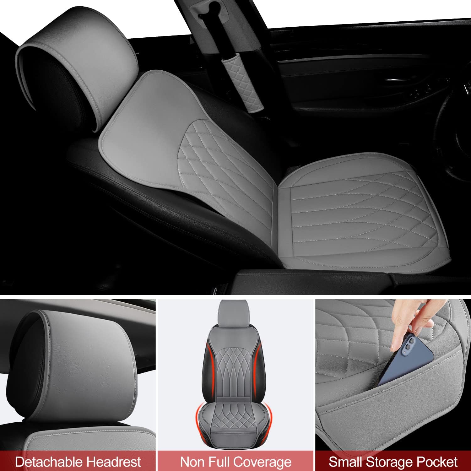 1 Pack Leather Front Car Seat Cover, Universal Sideless Car Seat Protector with Storage Pocket and Seat Belt Pad, Waterproof Automotive Seat Cover Cars Trucks SUV(Grey)