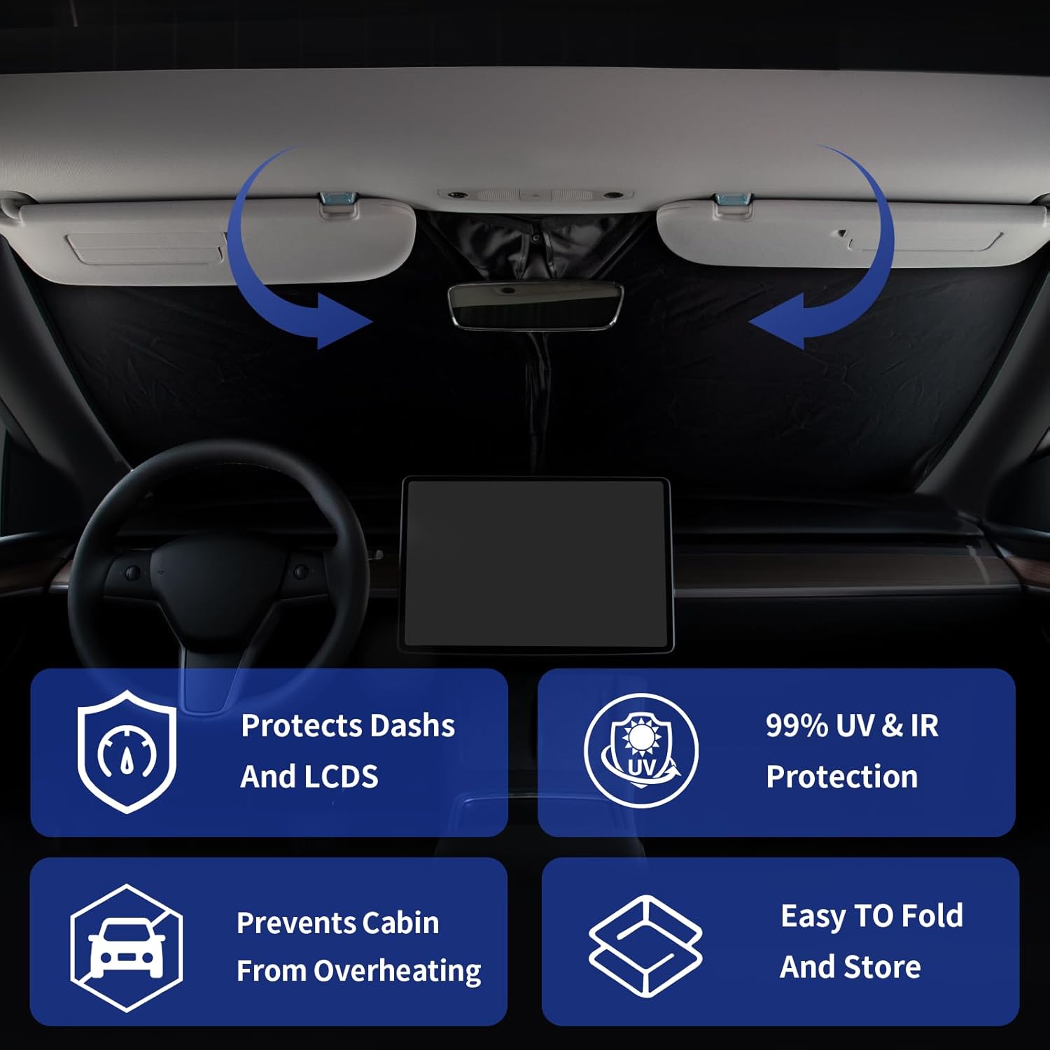 - 【UV Relfective and Easy Install】Our Sunshades in first try and Installing the Sun Shade takes only 10 seconds. The windshield sunshade provides excellent sun protection for the inside of vehicles. Your car's interior temperature will remain at an ideal level thanks to the premium, long-lasting 240T Sun Shield Reflective Polyester sun blocker screen protector material!
