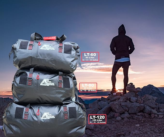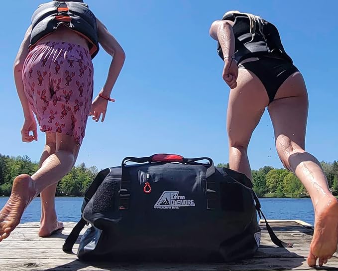 - [SPACIOUS STORAGE CAPACITY] With an impressive capacity of 60 Liters (approximately 15.8 gallons). This black waterproof bag holds the equivalent of 8 NBA basketballs or 4 winter rated sleeping bags, 30 pairs of jeans. The bag measures 19x11x23 inches (48x28x58cm). From motorcycling and boating to camping, hiking, kayaking, jetskiing, rafting, paddleboarding, sailing, hunting, and traveling, the Dry Water Adventure duffel bag is versatile and adaptable to a wide range of outdoor activities.