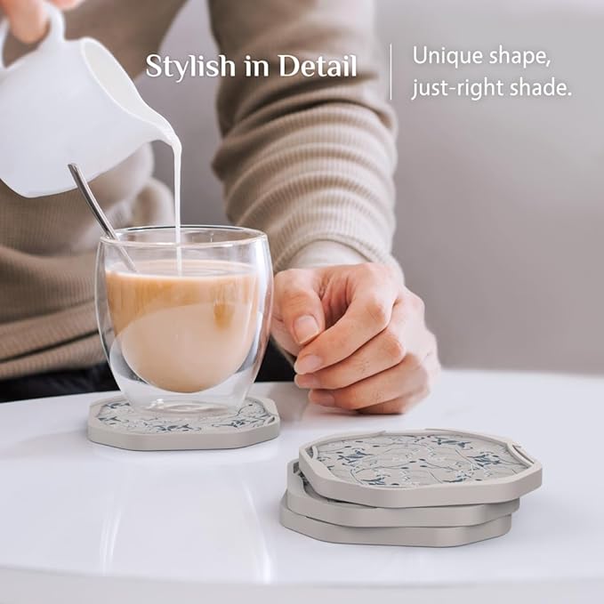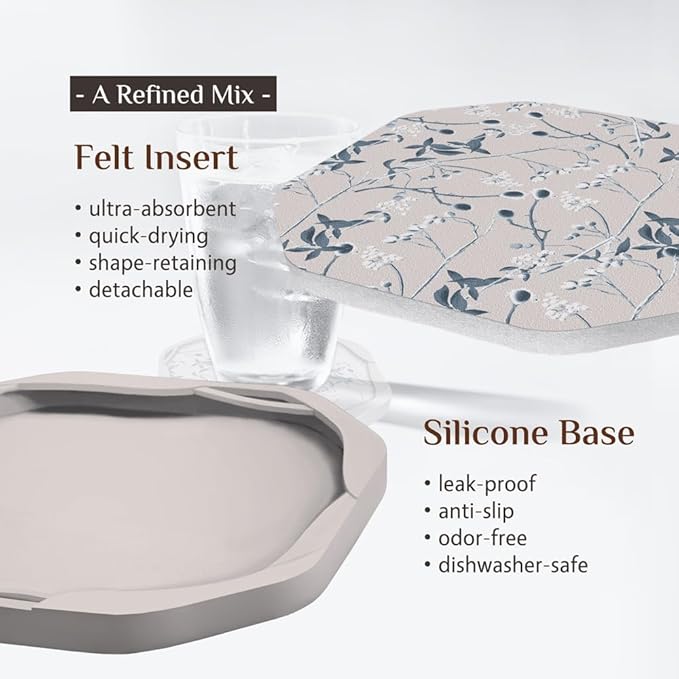 - HYBRID SILICONE AND FELT - It combines the best of both materials for a lightweight yet durable, all-purpose coaster. The non-slip silicone base keeps your cups in place while the super absorbent felt insert soaks up any moisture from your glass. In addition, the decorative case has a pretty lip with charming reliefs around the edges, which nicely frames the tailored insert, preventing it from popping up