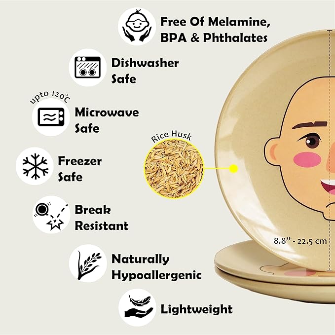 - UNBREAKABLE, HIGH QUALITY, NATURAL MATERIAL _ These biodegradable kid plates are made from rice husk, making them break resistant, stain resistant, & lightweight. Designed with kids' safety in mind, we take pride in that our plates are not only environmentally friendly, but are also free of BPA, Melamine and Phthalates.