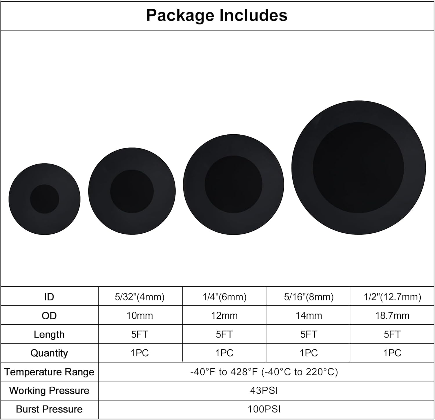 - Package includes: 4pcs 5ft(1.5m) silicone vacuum hoses with inner diameter of 5/32"(4mm), 1/4"(6mm), 5/16"(8mm) and 1/2"(12.7mm).