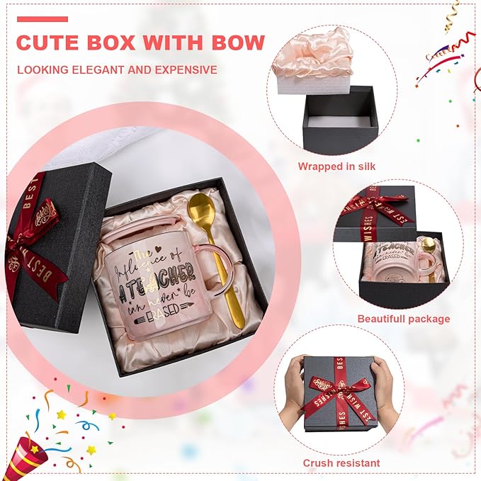 - Elegant Gift Box Packing: 1 x 14 oz Teacher mug(Pink),1 x Cup Lids, 1 x Gold Colour Spoons, 1 x Pink Greeting card(write down your blessings). All come in an ELEGANT GIFT BOX with satin lining. The box is sturdy enough to keep the product safely delivered to you. Designed for gift giving, No need to repack