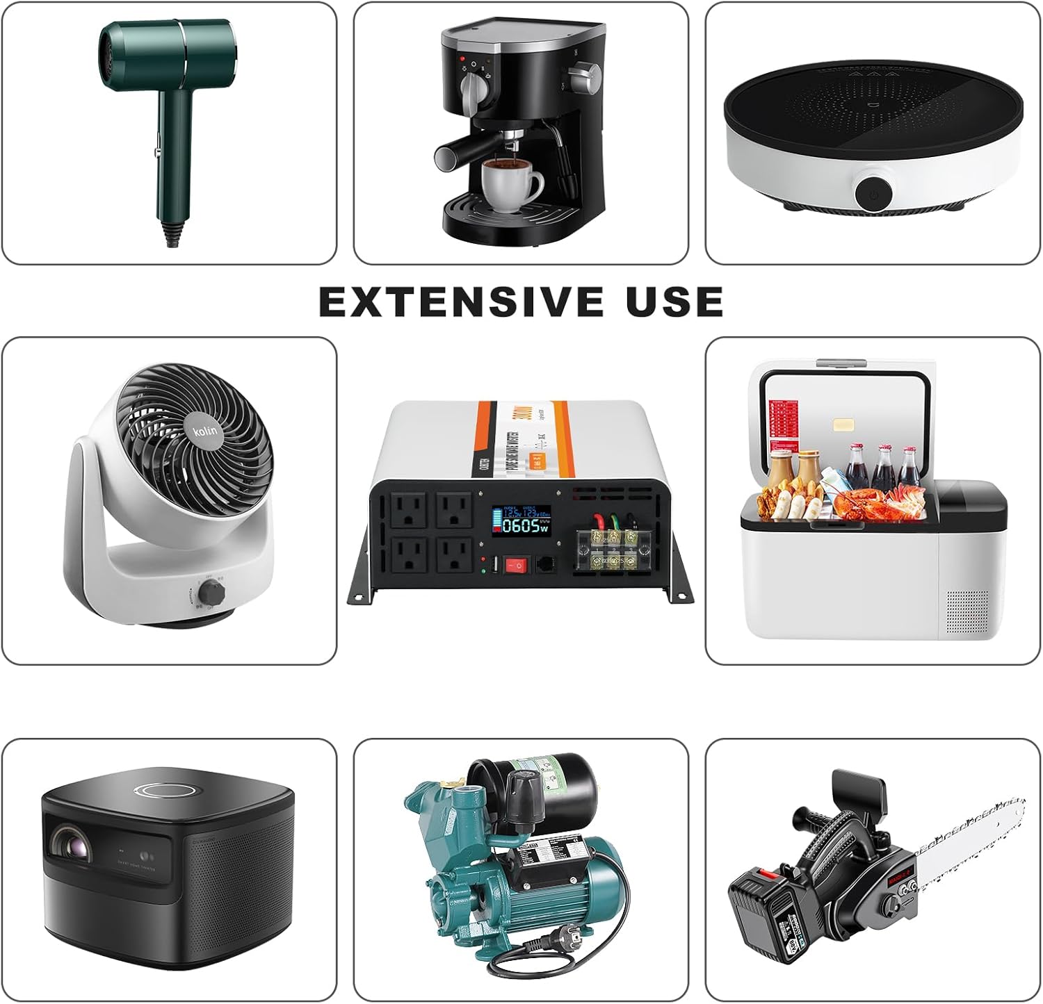 - WIDELY APPLICATION: The RV power inverter features with 4 AC outlets (each rated at 15 Amps), 1 AC terminal block (at 25 Amps), 1 USB port. Use it to power your coffee maker, microwave, power tool, refrigerator and other sensitive electronic equipment.