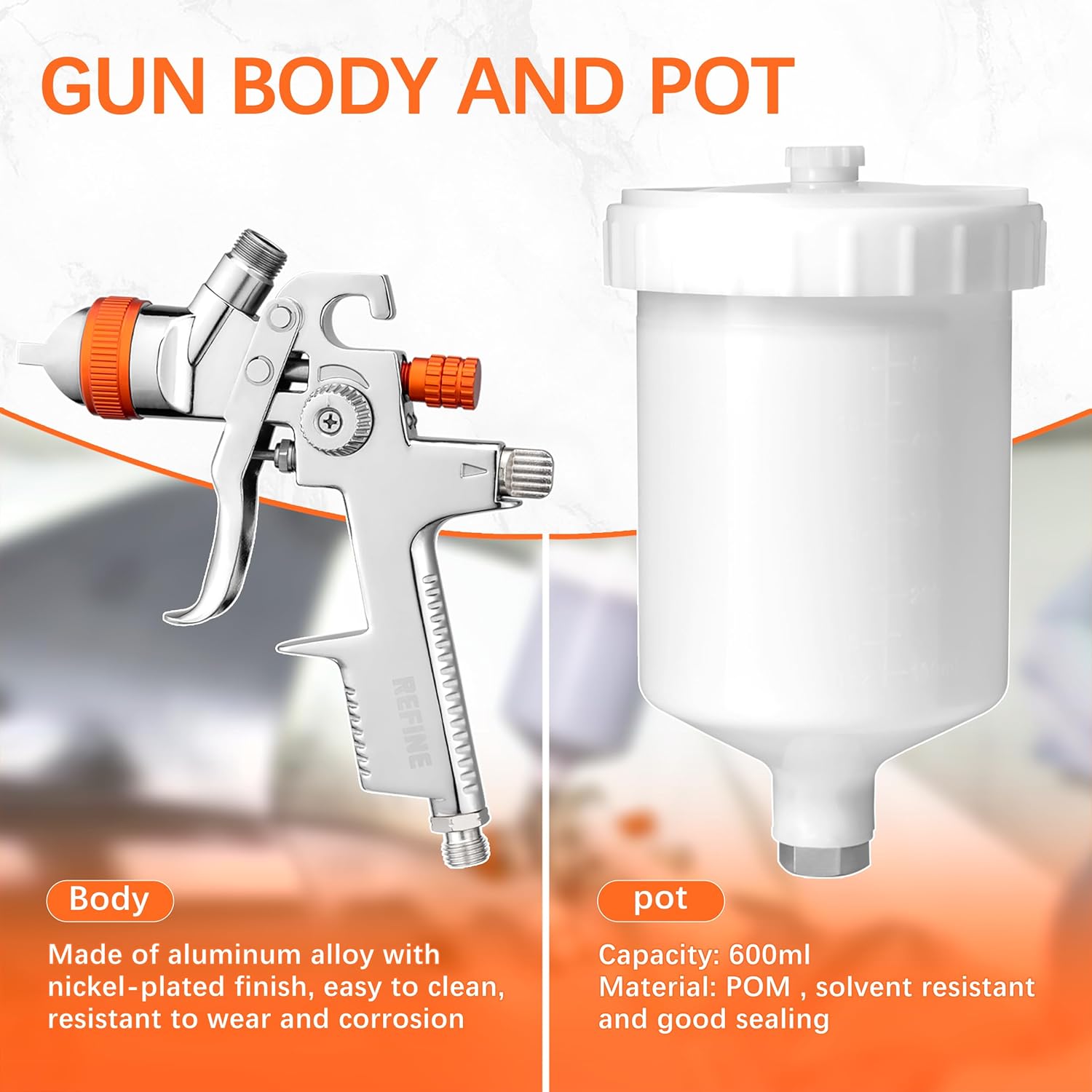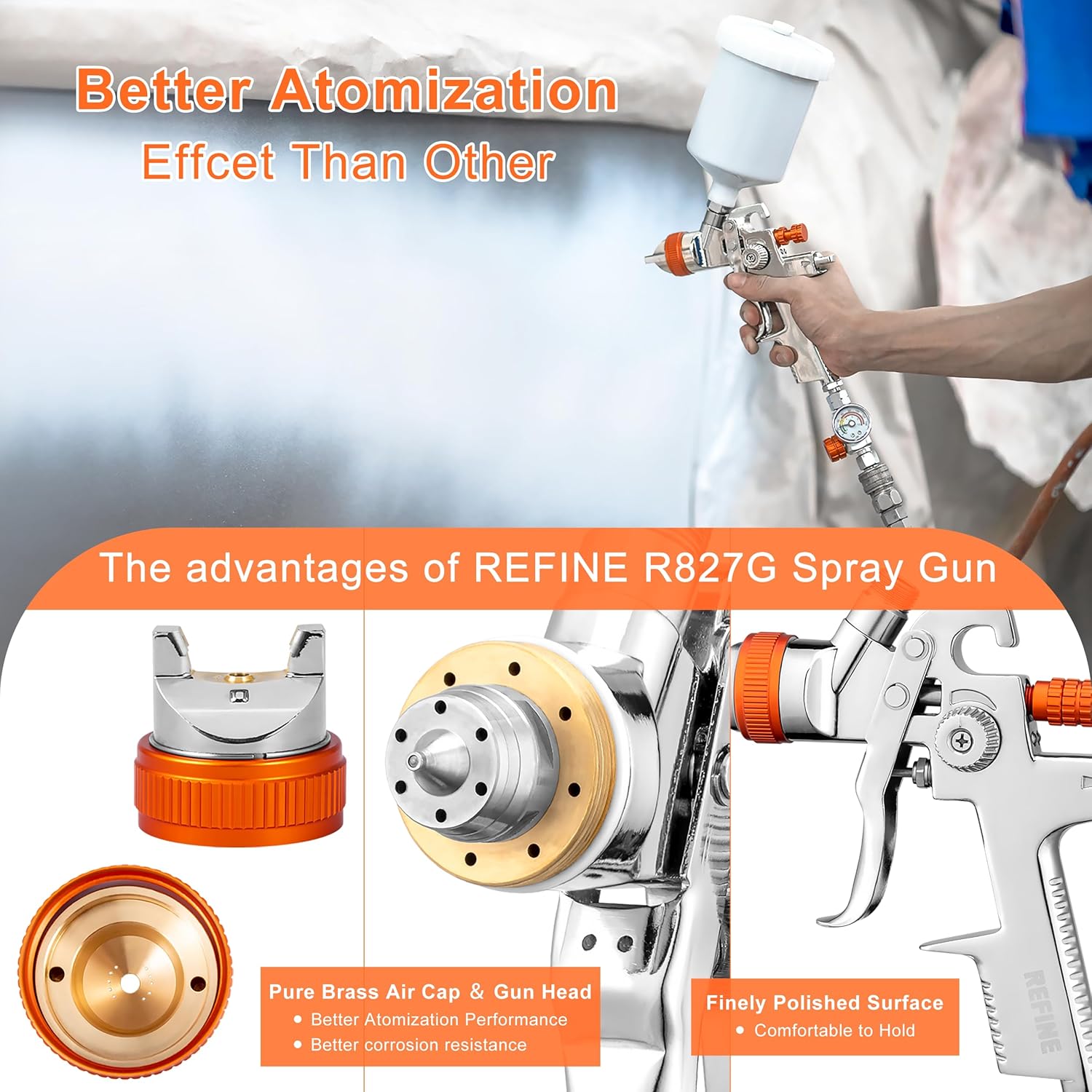 - 【Superior Workmanship】REFINE air spray gun body is made of aluminum alloy, adopting nickel plating technology, and the surface is finely polished. It has a 15-hole pure brass air cap, the nozzle and needle are made of hard stainless steel. All these features make it easy to clean, resistant to corrosion, durable, and have a longer lifespan.