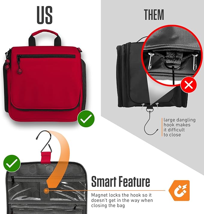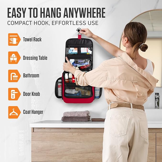 VENTURE 4TH Hanging Travel Toiletry Bag for Women & Men - Travel Organizer with Expandable Compartments & Removable Clear Pouch for Toiletries (Red)