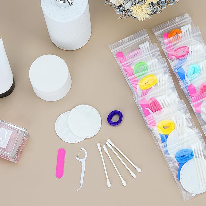 - Package contents: Hotel vanity sets x 50 (Each set contains cotton pads x 2, cotton swabs x 4, dental floss x 1, nail file x 1 (color random), hair tie x 1 (color random))