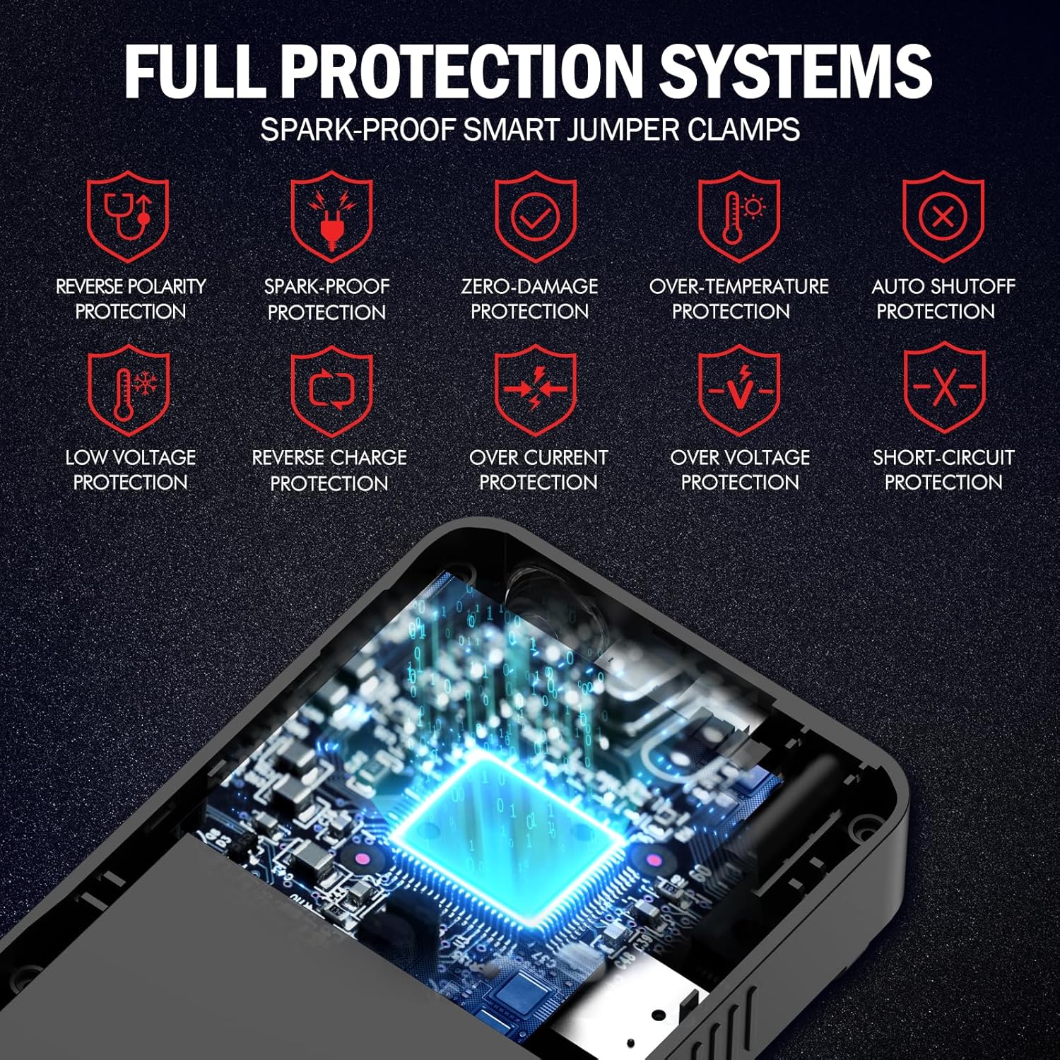 - 【 SAFETY PROTECTION SYSTEM 】 This portable car jump starter is very safe and easy to use. The all-metal jumper clamps are designed to be sturdy and durable, it provides versatile protection systems including low/high voltage, over-temperature, short-circuit, reverse polarity and jump starter time out protection, without the worry of incorrect connections or sparks. The excellent conductivity and durability can start your battery quickly and safely, even in extreme temperatures (-4°F~140°F).
