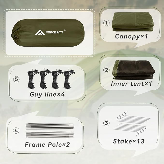 - Lightweight & Convenient: The internal size of the Forceatt camping tent is 86.6x51.1x43.3in (220x130x110cm), which can accommodate two person at the same time. At the same time, it has a package size of 41 x 14cm and weighs 5.68lb (2.58kg), which saves space and is easy to carry.