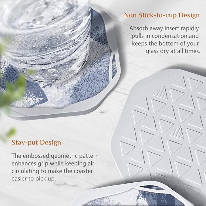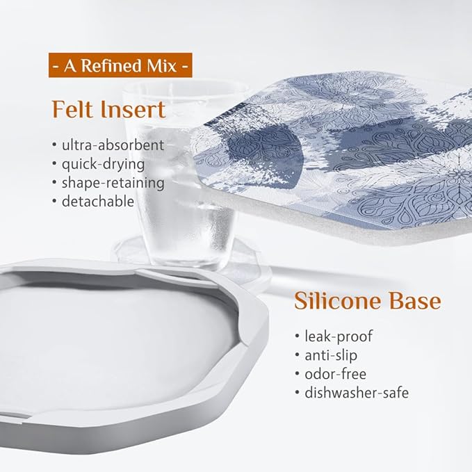 - HYBRID SILICONE AND FELT - It combines the best of both materials for a lightweight yet durable, all-purpose coaster. The non-slip silicone base keeps your cups in place while the super absorbent felt pad soaks up any moisture from your glass. In addition, the case has a lip with charming reliefs around the edges, which nicely frames the tailored insert, preventing it from popping up