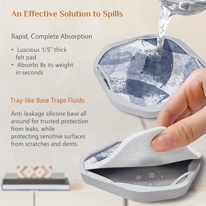 - RESPECT WOOD - Featuring material mashup, it effortlessly protects your table - all day, every day [ Safe from Spills and Permanent Damage ] The 1⁄5" thick felt pad can absorb as much as ¼ cup of liquid in seconds, and the silicone base offers leak-free protection while protecting your sensitive surfaces from scratches and dents [ Elevated Experience ] The embossed geometric pattern enhances grip without leaving residue while keeping air circulating to make the coaster easier to pick up