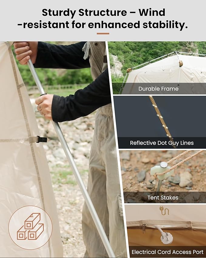 - EXCELLENT VENTILATION: Stay cool even on hot days with the tent’s outstanding ventilation system. Two large breathable mesh windows and two side windows promote cross-ventilation, while the 3 extendable awnings enhance airflow and reduce heat buildup, keeping the interior comfortable.