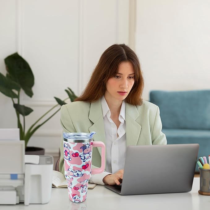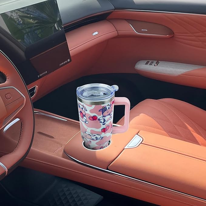 40 oz Tumbler with Handle and Straw, Stainless Steel Insulated Cup with Leak Proof Lid and Straw Lid, Keep Drinks Cold and Hot for Hours(Strawberry Cow)