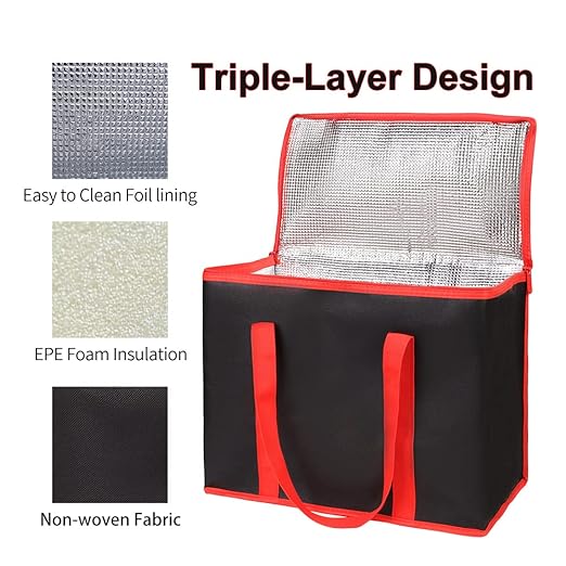 Bodaon 1-Pack Insulated Reusable Grocery Shopping Bags, X-Large Picnic Cooler Bag with Zipper Zippered Top Cold, Insulated Food/Pizza Delivery Bag (Black-Red Edge)