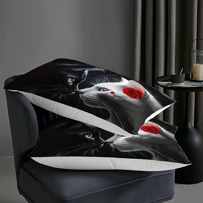 AILONEN Rose Cat Comforter Set Queen Size, Black & White Cat Couple Bedding Set for Kids Boys,Valentine Room Decor Romantic Duvet Set 3 Pieces, 1 Quilt and 2 Pillowcases