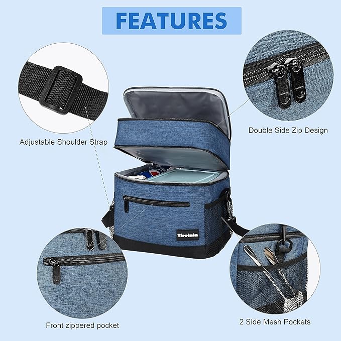 - Large Capacity Double Layer Lunch Box - This unisex insulated bag comes with 2 thermal compartments, which can be used for different purposes and separate hot and cold food, drinks, beverages, etc. The reusable lunch bag measures 9.85*8.72*10.63 inches and has a high capacity of up to 17L. Additionally, it features mesh pockets on both sides and a front zipper pocket, making it easy to store all the lunches or picnic essentials you need.