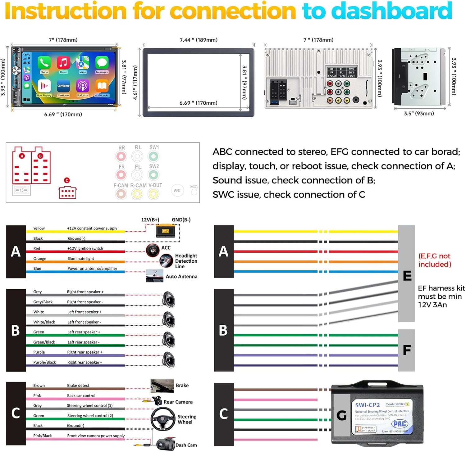 - Important Tips: ①Please make sure your dash board opening size fits our car stereo. If our stereo size does not meet your dash size, you will need to purchase an additional suitable dash kit. ②Please read the instructions before installation and it is recommended to install at a professional car audio shop. ③Some car models also require two additional after accessories to complete the installation: Wire harness adapter and radio antenna adapter for your car model.
