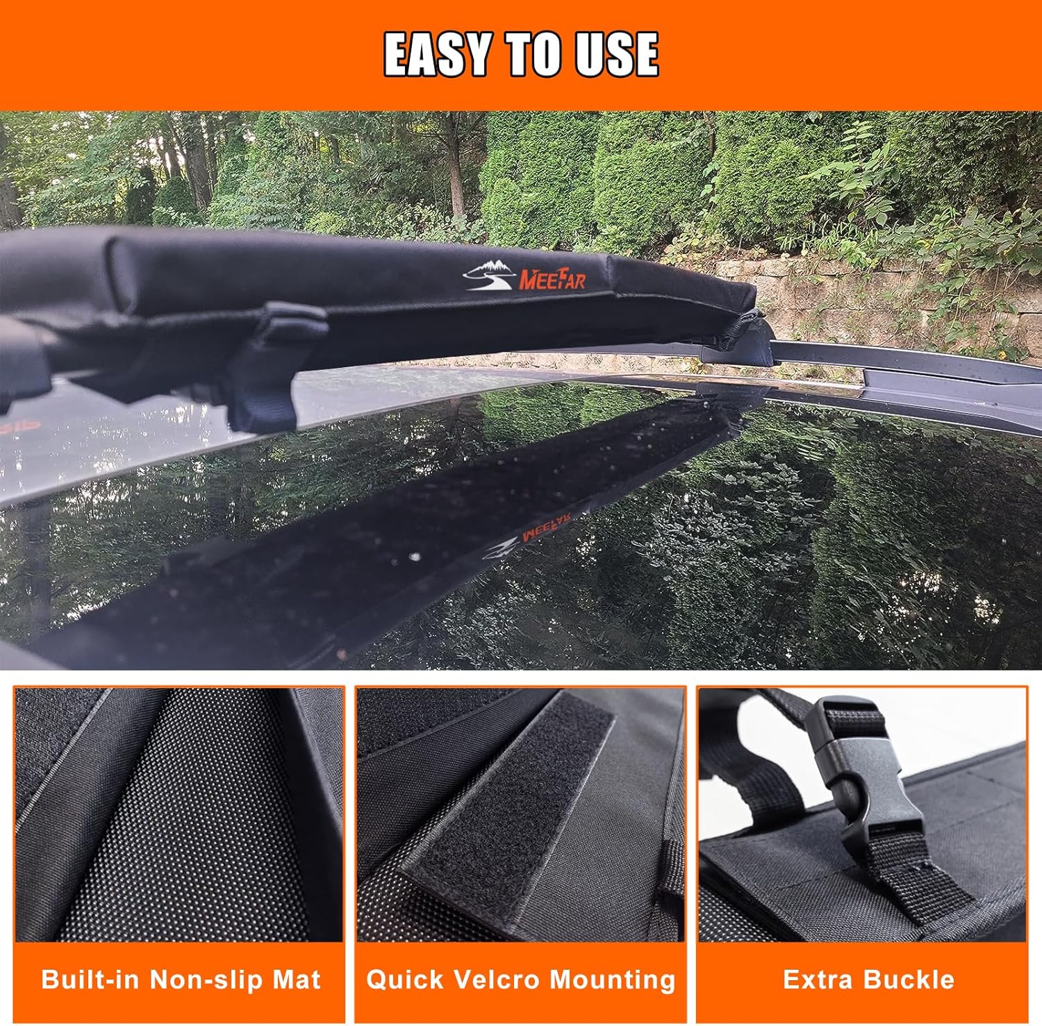 MeeFar Universal Roof Rack Pads Fit on Cross Bars - for Kayak/Surfboard/SUP/Canoe with 2 Heavy Duty Tie Down Straps, 2 Tie Down Rope, 2 Quick Loop Strap and Storage Bag