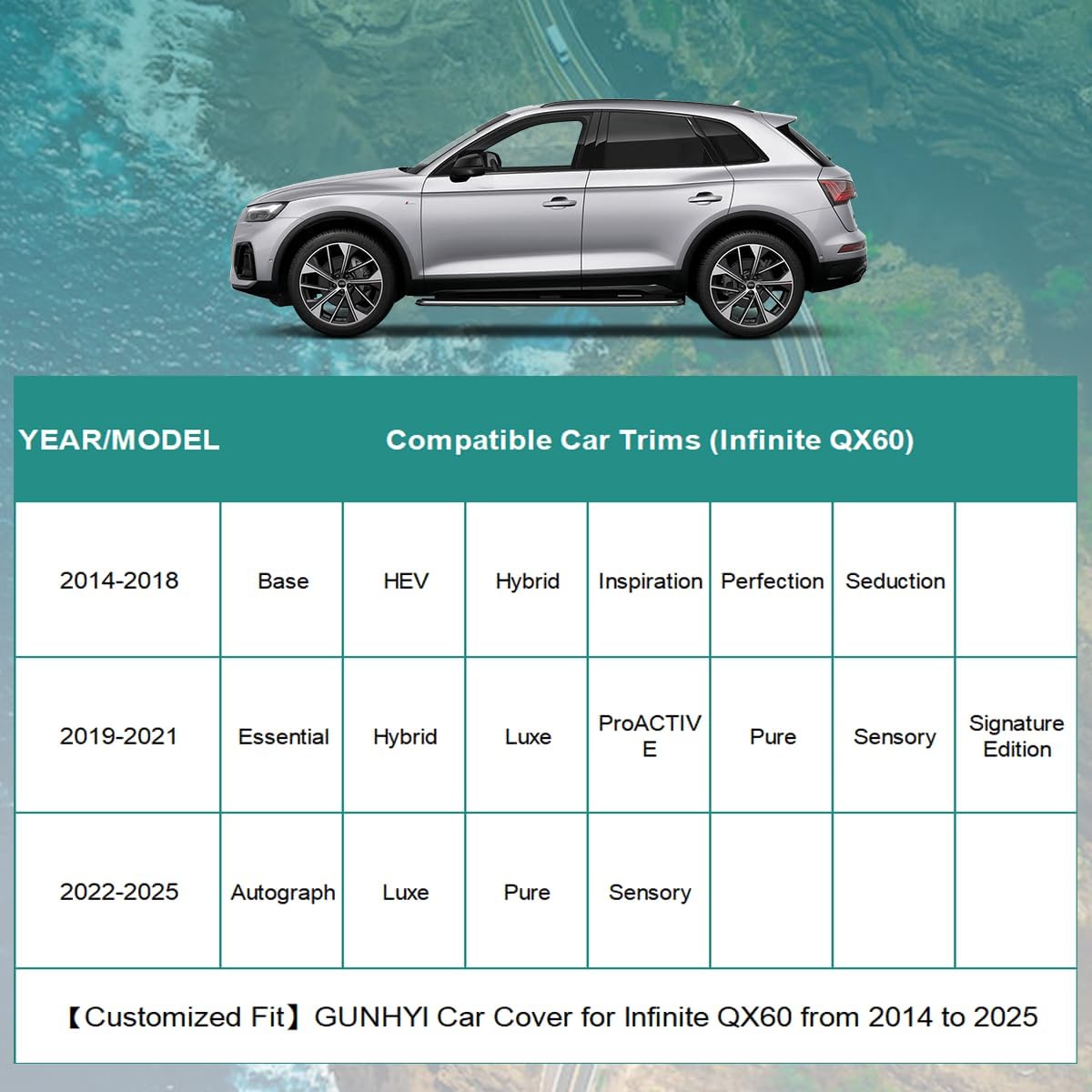 - 【Compatible with】This Full Car Cover Custom fit for Infiniti QX60 from 2013 to 2025. Comes with a microfiber towel that you can use to clean your car, because if there is sand on the surface of the car before use, it may damage the paint.