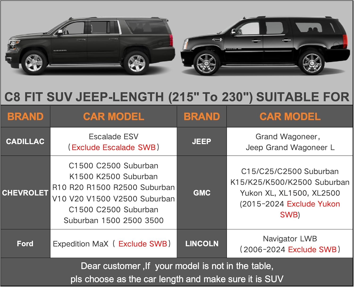 - 【Dimension C8】Universal fit for Suv which length is 215-230 inch (Not for hatchback and sedan). Suitable for Chevrolet Chevy Suburban, GMC Yukon XL, Cadillac Escalade ESV, Ford Expedition Max etc.