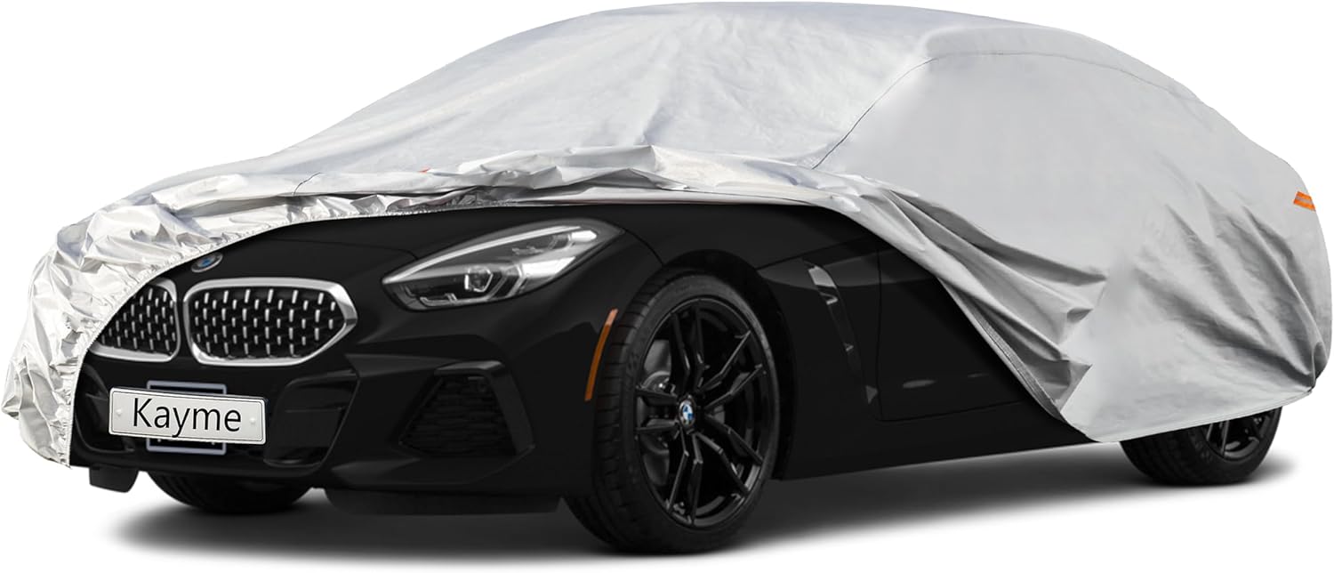 - 【Premium Material】-Kayme 6 layers car cover is made of heavy duty material. 1 PE&PEVA is 100% waterproof, It's great for rainproof snowproofing. 2 High reflective aluminum is good at sunproof and anti-uv, Keep the car cool in the summer. 3 Thicker and soft cotton will protect vehicle painting. Kayme multi-layer material is much thicker and more durable than other similar products.