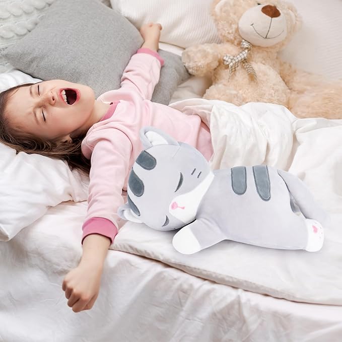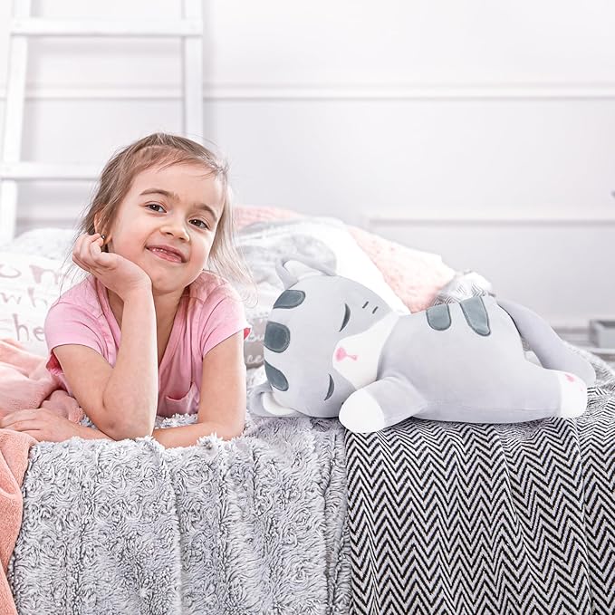 - 【Saft Material】Cat plush pillow is soft and comfortable, plush animals each part of the uniform full filling, not afraid of extrusion, not easy to deformation.The fabric is made of high quality short plush fabric, which feels very good.Cat stuffed animals have ASTM F963-17 and CPSIA safety tests and get a Children’s Product Certificate (CPC). It is safe for children and is friendly to the skin. Don't worry about your child's being allergic.