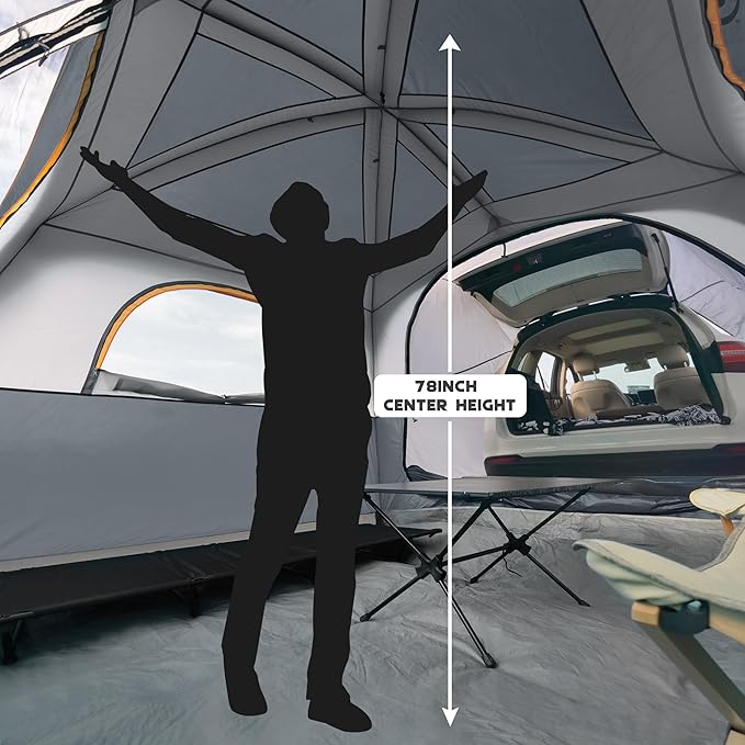- Seamless Connection with Your Car: This tailgate tent features an adjustable vehicle sleeve that can be attached to the back of any size SUV, it can seamlessly attach to your vehicle, offering additional sleeping and storage space