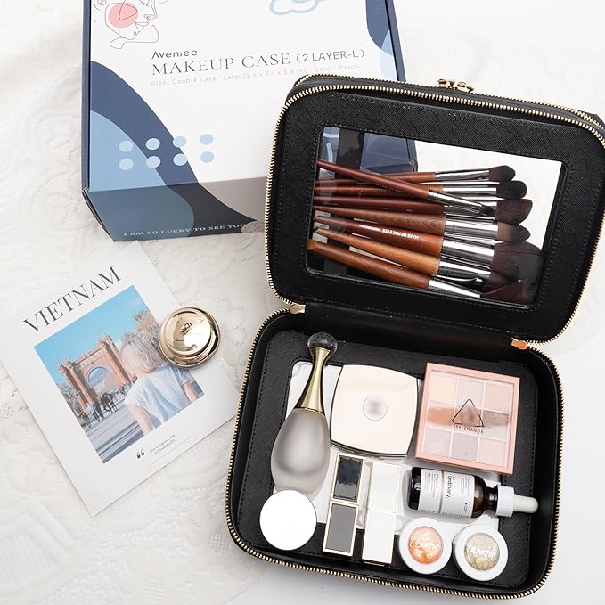 Aveniee Clear Makeup Bags, Double Layer Cosmetic Bags with a Separate Brush Compartment, Travel Toiletry Bag Train Case for Women, Travel Accessories Organizer for Purse(2 Layers Large, Black)