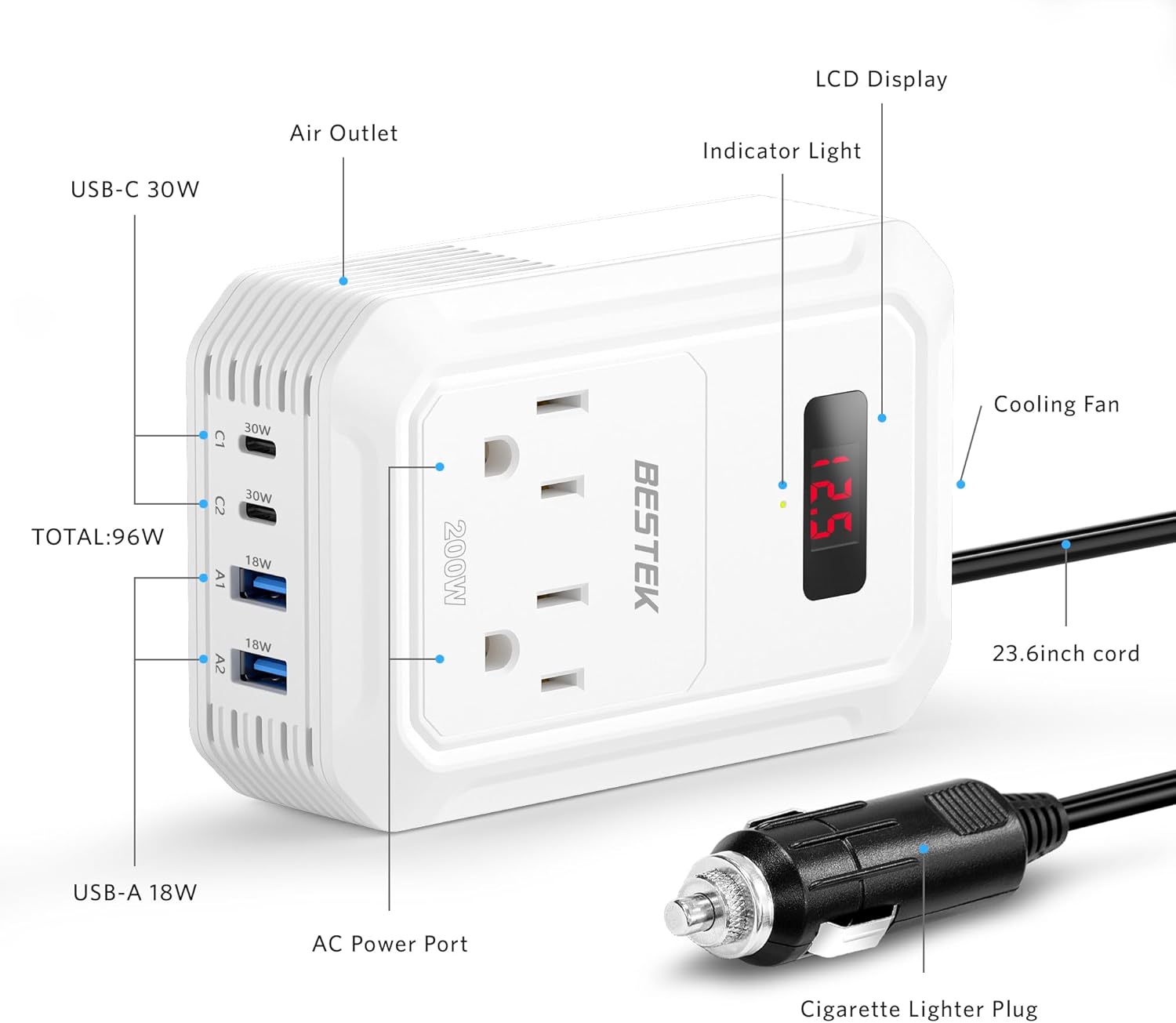- BESTEK Advantage: America's leading power inverter brand. Provides 200 Watts continuous DC 12v to AC 110v power inverter featuring 2xPD 30W&2xQC 18W USB ports, 2 AC outlets, and a 23.8-inch cable with cigarette lighter plug and LCD Display for you, more convenient.